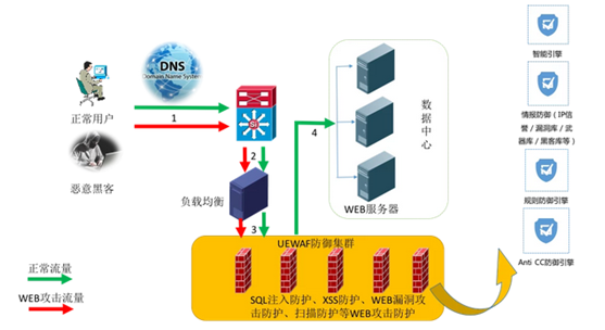 根据中企动力对安全的重视程度,UCloud为其定制了安全方案:一方面,针对DDoS攻击,UCloud提供BGP线路高防数十G阈值的DDoS流量防护能力,保障网络质量稳定;另一方面,针对CC攻击,由于域名数量大,提供UEWAF企业级防火墙产品,结合API实现自动化配置接入方式,减少人工手动配置过程。